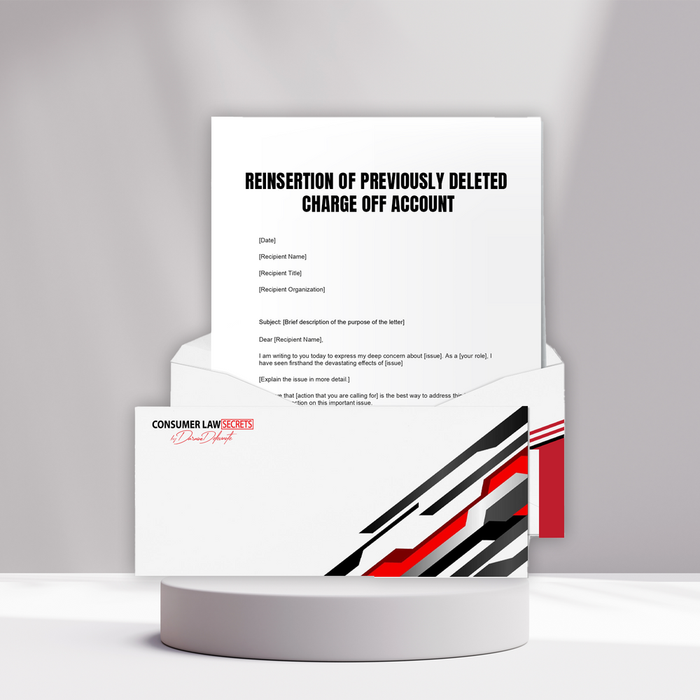 Ensure your credit report reflects accurate information. Purchase our "Reinsertion of Previously Deleted Charge Off Account" template today and take the first step towards a healthier credit profile.